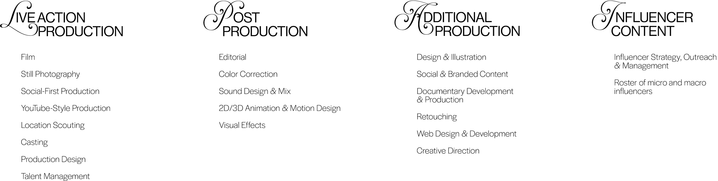 From traditional commercial production and post production needs to beautifully crafted art books, bespoke experiences, native social content and more. If it’s creative, we’re probably doing it.
